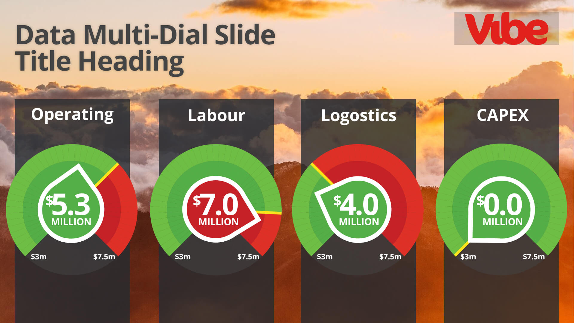 The Data Multi-Dial template is designed to clearly display your key performance indicators (KPIs) and financial figures. Each dial showcases numbers, dollar amounts, or percentages, indicating whether youre hitting your targets. With space for up to 12 dials, this slide offers a detailed and visually engaging summary of your critical metrics.