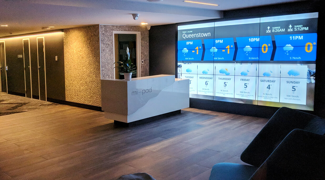 The Digital Video Wall, powered by Vibe.fyi's software, transformed Mi-pad Queenstown’s guest experience by delivering real-time, localized infotainment in a visually engaging format.