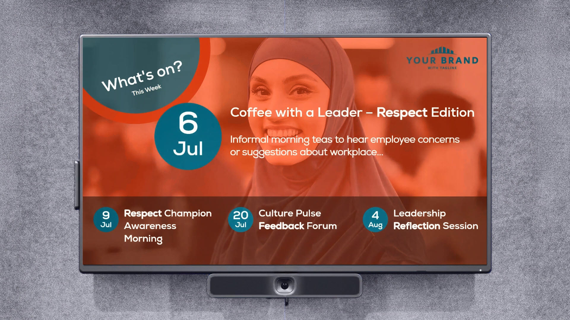 - Digital Signage for Frontline Teams High-impact displays in break rooms, warehouses, and operational areas ensure Respect@Work messaging reaches the teams who rarely check email or intranets, but see screens every day.