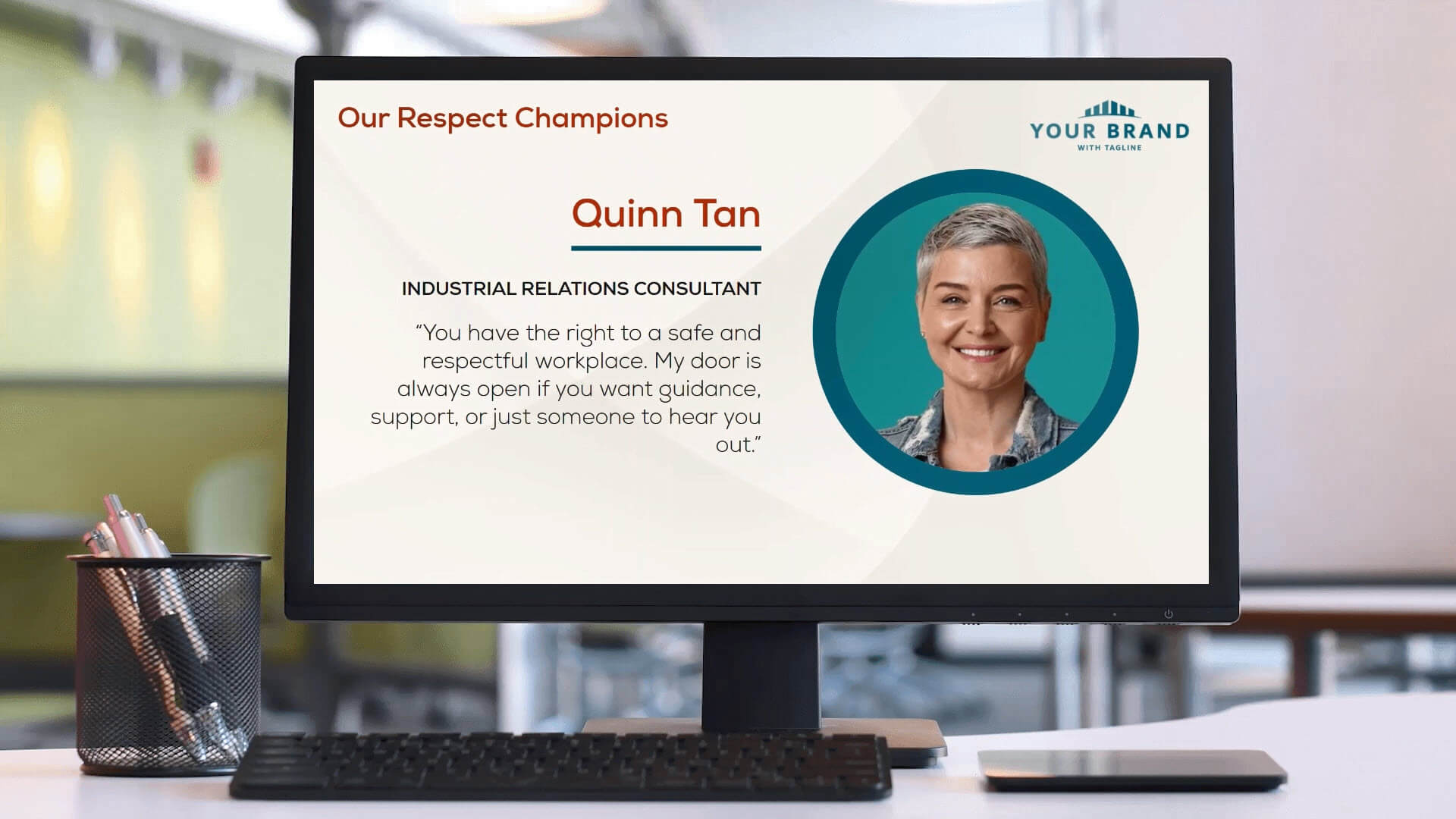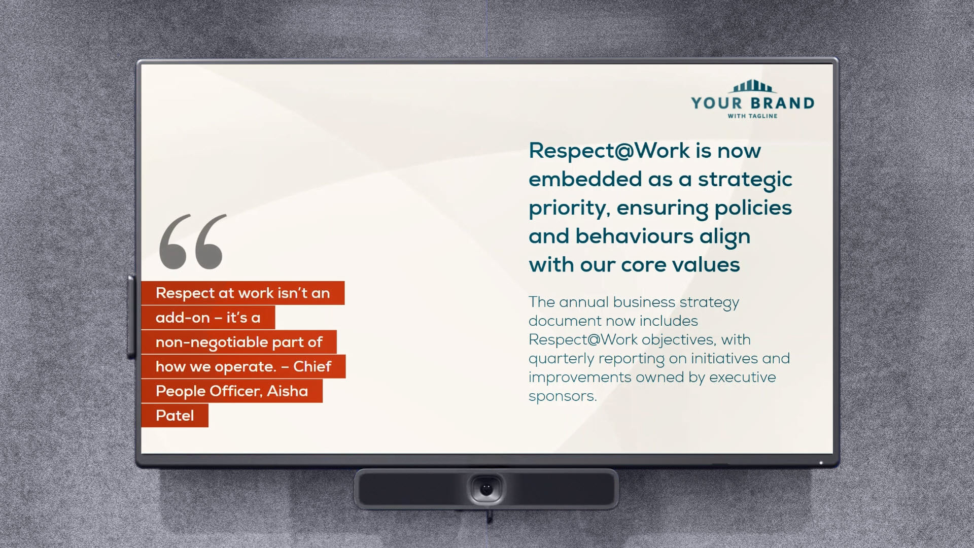 - Meeting Room & Visitor Displays Extend your culture of respect to shared spaces and reception areas. These screens reinforce your values to employees and visitors alike, making Respect@Work part of the environment, not just the onboarding.
